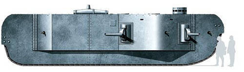 Корпус танка собирался из больших катаных листов, крепившихся к каркасу заклепками и болтами. Съемные спонсоны имели сложную в плане форму. В скошенных передней и задней стенках уширенной части спонсона имелись орудийные амбразуры, в которые устанавливалась 77-мм капонирная пушка с полуавтоматическим затвором. Качающаяся часть орудия крепилась на поворотной тумбе с полуцилиндрическим щитом и ограждением казенной части. Слева от ограждения находилось сиденье наводчика. Для наводки он пользовался телескопическим прицелом и соосными маховиками. В передней стенке спонсона у угла располагалась установка пулемета MG.08. Такие же пулеметные установки имелись в узкой задней части спонсона, в бортах и лобовом листе отделения управления.