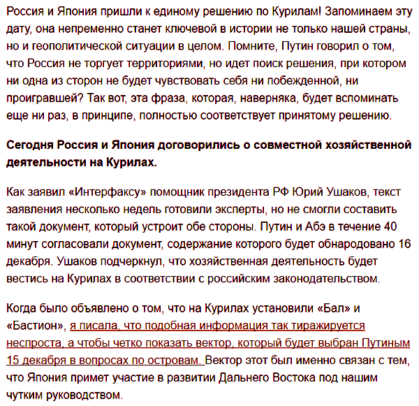 «Если кто-то считает, что мы заинтересованы исключительно в налаживании экономических связей, а мирный договор откладываем на второй план, — это не так, — цитирует российского лидера «Комсомольская правда». — На мой взгляд, самым главным является заключение мирного договора, потому что это создаст нам условия для долгосрочного взаимодействия в исторической перспективе. Это важнее, чем деятельность на островах. Япония жила без сотрудничества с Россией 70 лет, и мы жили. Мы можем так жить дальше? Можем. Но это будет правильно? Нет, неправильно. Нужно прекратить этот исторический пинг-понг Курилами. Нужно в конце концов понять, что фундаментальные интересы и Японии, и России требуют окончательного долгосрочного урегулирования».