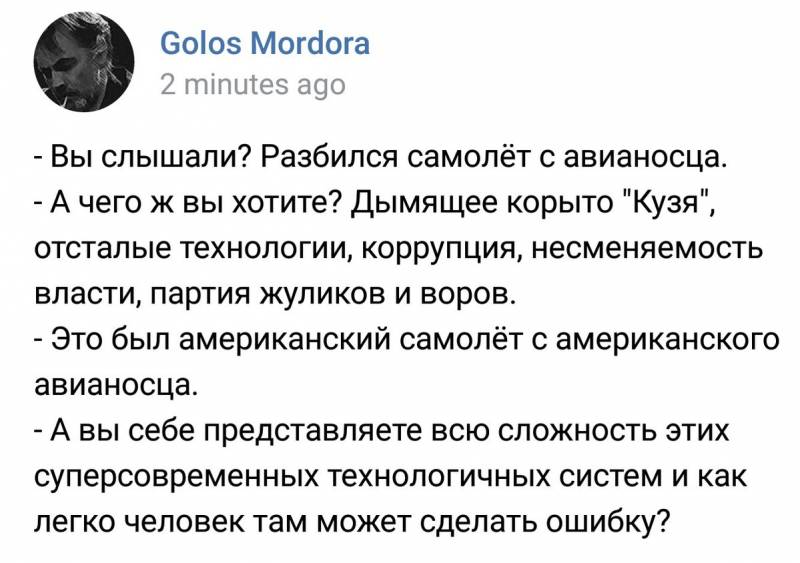 Крушение произошло, когда самолет из второй палубной эскадрильи приближался к авианосцу. Отмечается, что это был "обычный полет". Инцидент сейчас расследуется.