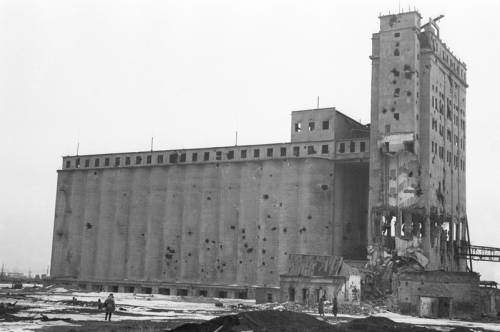 На фото видно, что, судя по многочисленным выбоинам, дом обстреливался с торца. Окна под таким углом были недоступны для обстрела. Обороняющиеся имели две или три огневые точки. Одна - снизу справа на первом этаже (на фото видны остатки бойницы в плите), которая была уничтожена попаданием снаряда. Другая или другие огневые точки находились на уровне 5 или 6 этажа, в глубине помещений, причем огонь велся сразу через дверной и оконный проем. Штурмующие потратили много сил и боеприпасов, чтобы эти точки подавить.