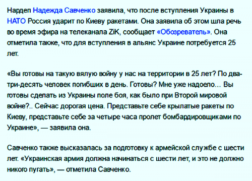 Готовить украинских детей к войне и обучать их обращению с оружием надо с шести лет. Такая подготовка должна стать краеугольным камнем в школьной программе, передает ФАН заявление депутата Верховной рады Надежды Савченко.