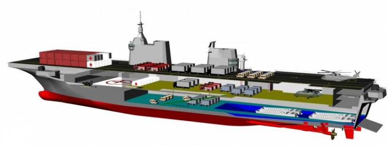 Корабль будет оборудоваться специальной системой грузовых лифтов, с помощью которых во внутренние отсеки может спускаться военная техника, грузовые контейнеры, различное оборудование.