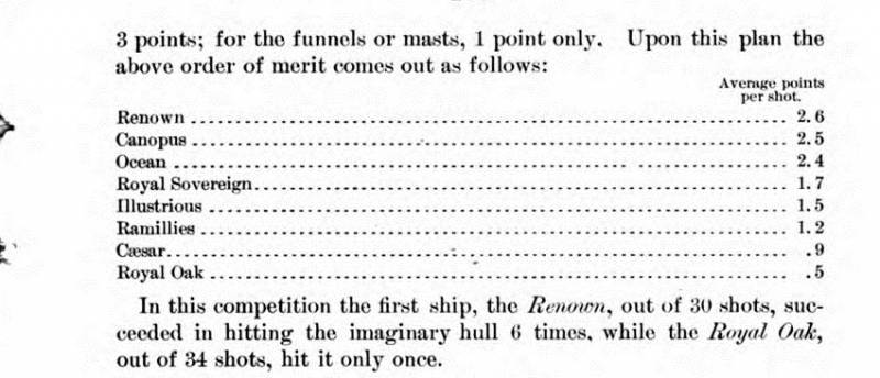 Результаты первых стрельб, П. Скотт охарактеризовал как «плачевные». Впрочем, по-другому и быть не могло – Королевский флот в 1905 г не располагал ни правилами стрельбы, ни прицелами, отвечающими своему назначению, ни приборами управления стрельбой. Иными словами, стрелять на 25-35 кабельтовых британские артиллеристы попросту не умели.