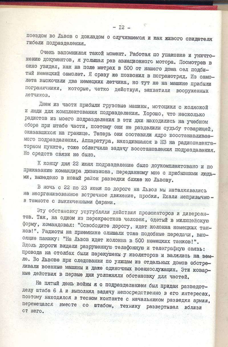 22 июня война застала нас в районе рассредоточения. Еще перед рассветом… 22 июня мы получили информацию из штаба 6-й армии о возможном переходе в наступление фашистских войск с утра этого дня… Тут же все части были подняты по тревоге и приведены в полную боевую готовность все вооружение и боевая техника. Ждали рассвета. Точные сведения о начале военные действий мы получили от противника – его авиация начала бомбить ближайшие от нас аэродромы…»