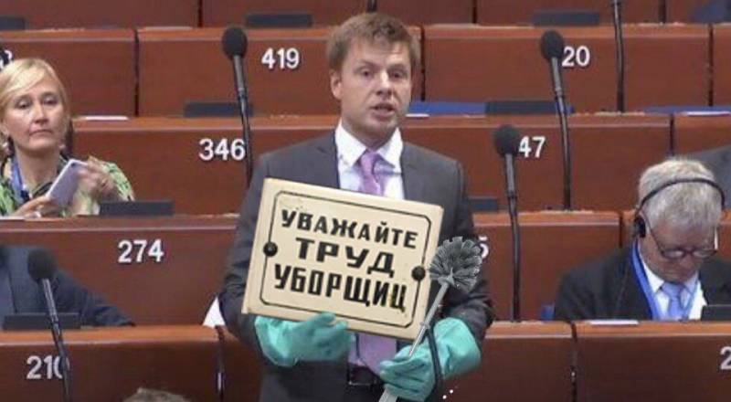 Ранее явившийся на заседание ПАСЕ в резиновых перчатках Гончаренко отказался общаться с представителями российских журналистов, опасаясь "отравиться Новичком", а перчатки надел из-за того, что "не хочет пожимать руки и трогать дверные ручки после русских".