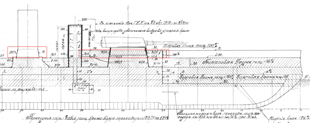 Увы, вертикальное бронирование корпуса выше главной палубы отменялось, от слова «совсем» (барбет башни, конечно, сохранялся).