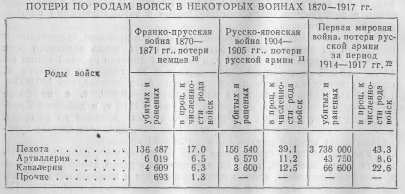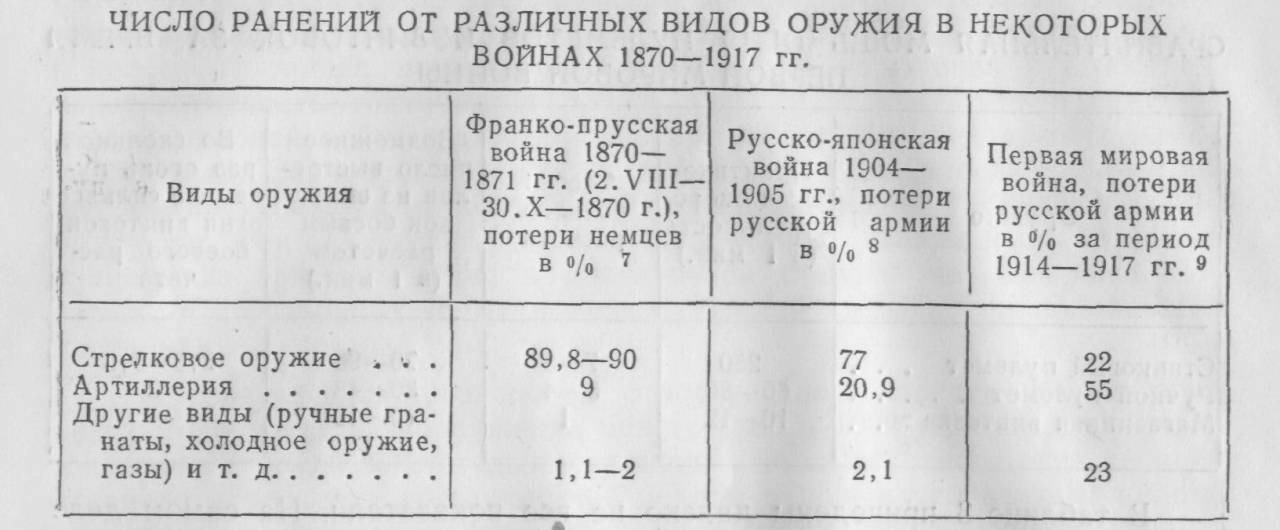Цифры в этой таблице могут, без серьезных ошибок, характеризовать и общие потери войск от различных видов оружия, так как процент убитых по отношению к общим потерям во всех рассмотренных войнах был почти одинаков, составляя 14,8 - 15,6.