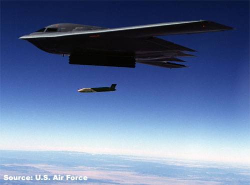 Ранее сообщалось, что американские бомбардировщики В-2 будут вооружены новой ядерной бомбой В61-12, которая заменит сразу три типа бомб, применяемых В-2 : B61-7 мощностью 10 - 360 килотонн, B61-11 400 килотонн, для наземных ударов и B83-1, используемую для разрушения подземных бункеров.