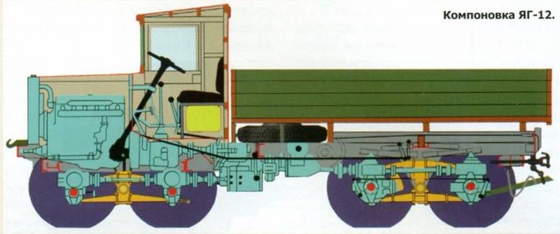 Новый грузовик ЯГ-12 должен был в известной мере походить на серийный ЯГ-10. Предлагалось использовать удлиненную раму из швеллеров, собранную на заклепках. Задняя ее часть усиливалась дополнительными профилями. В передней части рамы помещался силовой агрегат, за которым находилась кабина. Оставшаяся часть рамы отдавалась под установку грузовой площадки. Под двигателем и кабиной на раме предложили разместить переднюю тележку с парой осей. Два задних моста находились под кузовом.