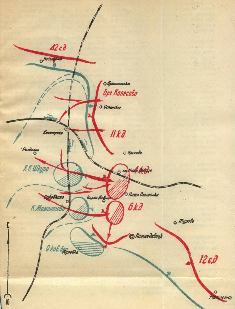 Так было 10-го ноября, когда совместными действиями 4-й и 6-й кавалерийских дивизий в районе Ниж. Девица была опрокинута и разбита белая конница. В этот момент создавалась угроза правому флангу и Буденный, справившись с одной частью белых, приостановив наступление и прикрывшись с юга, перебрасывает против наступающей пехоты противника свои главные силы, отразив и это наступление — причем с чувствительными потерями для белых.