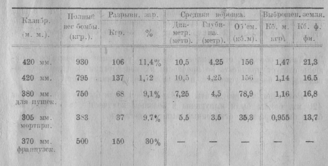 , выведенной на основании обмеров большого количества воронок в различных грунтах, где D1 и D2 – наибольший и наименьший диаметры воронки, h – ее глубина, V – объем. В данном случае D1 = D2.В конце таблицы приведены сведения о снаряде к 370-мм французской мортире сист. Filloux, по своим баллистическим данным похожей на германские 305-мм мортиры; относительный заряд в этой бомбе был втрое больше, нежели в схожих германских снарядах.