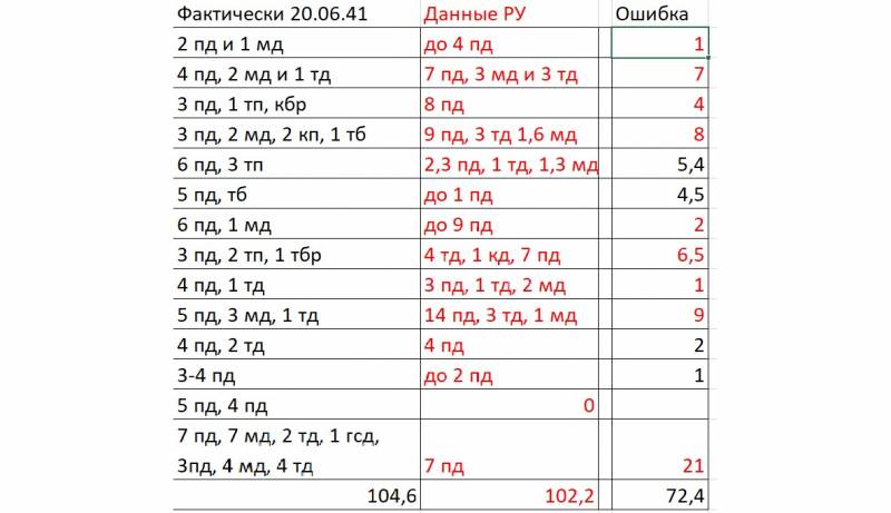 Поэтому 20 июня было подготовлено некое спецсообщение, которое еще не опубликовано. Часть информации из этого сообщения удалось получить при сравнении сообщения РУ от 31.05.1941 года и сводки № 1 РУ от 22 июня. Эта информация была рассмотрена в предыдущей части.