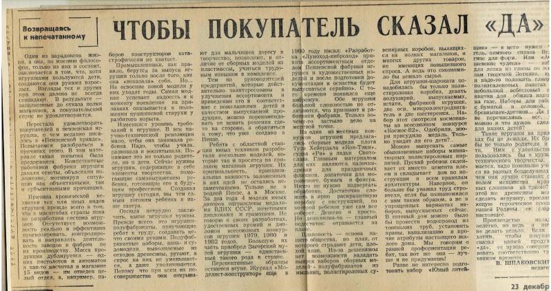 Возможность представилась в 1981 году, после возвращения из села, когда на местном ТВ я начал вести детскую передачу по техническому творчеству. Главред хотел сделать её максимально популярной и придумал ей название: «Давайте делать игрушки». И в каждой такой 30-минутной передаче я прямо на экране делал какую-то самоделку-игрушку. Девиз передачи был такой: «Не всякая игрушка модель, но любая модель может быть игрушкой!» Ну и во Всесоюзном конкурсе игрушек участвовал. И в конкурсе 1979 года, и 1980-го – посвящённого 110-й годовщине со дня рождения Ленина, и 1982-го…