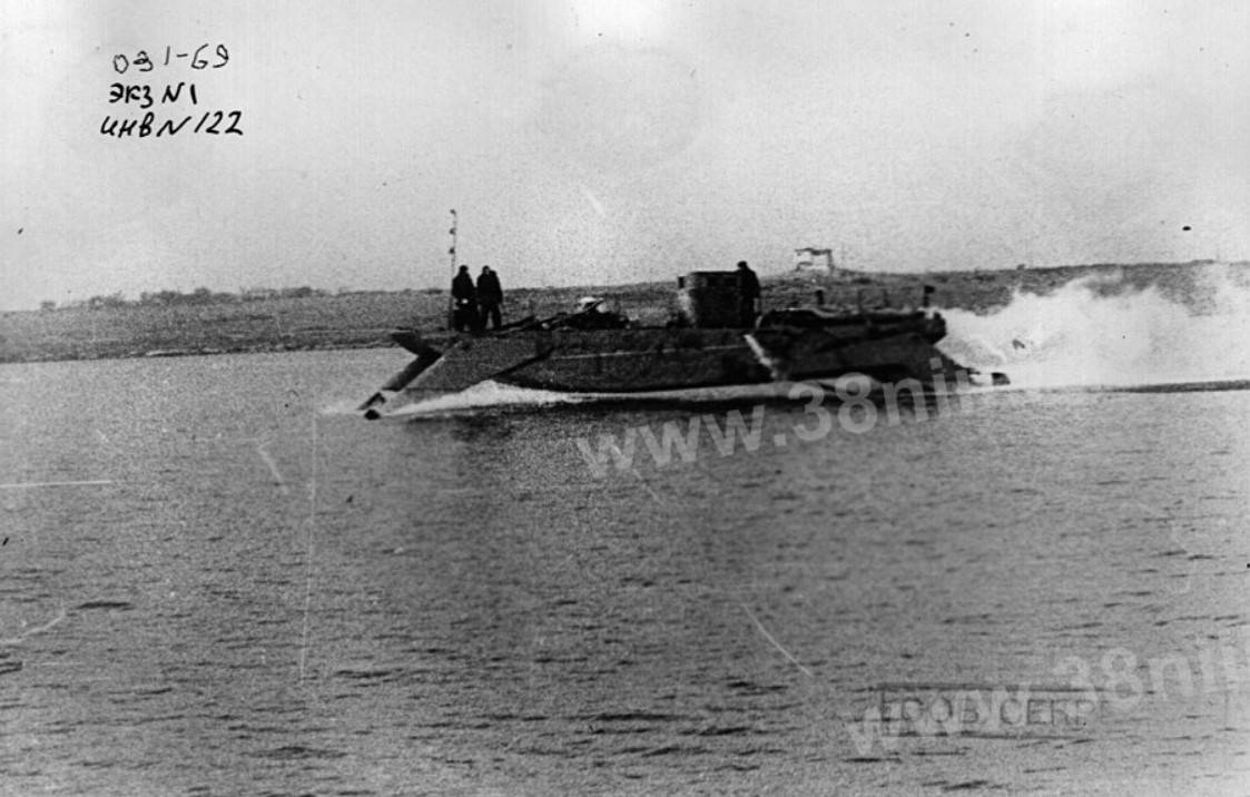 Потом производился пуск двигателей обоих катеров, и гидроприводы поднимали катера примерно на полметра от земли по обе стороны танка.