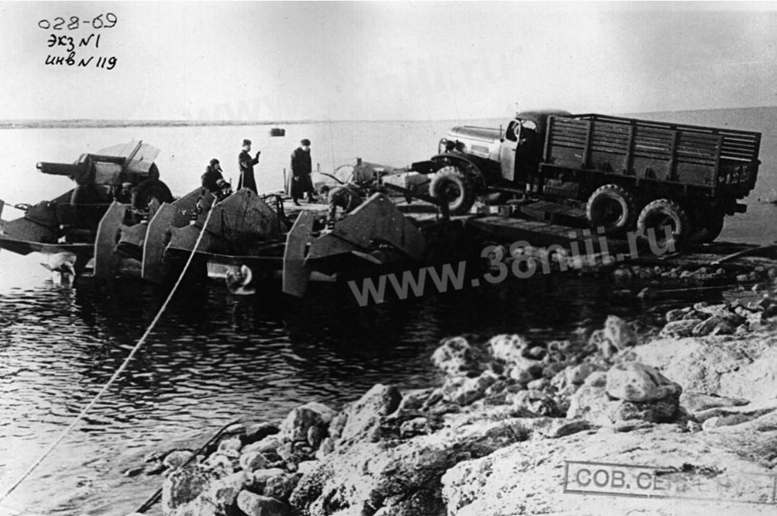 Погрузка автотягача ЗИЛ-157 на паром, 122-мм пушки-гаубица и боеприпасы погружены на кормовую часть. Источник: 38niii.ru
