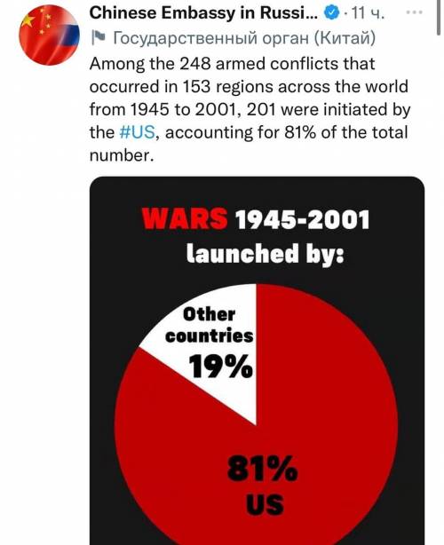 Ранее в Twitter посольства КНР в России появился пост, в котором Соединенные Штаты были названы главной угрозой миру на планете. В доказательство китайские дипломаты привели длинный список государств, в разные годы подвергшимся американским бомбардировкам.