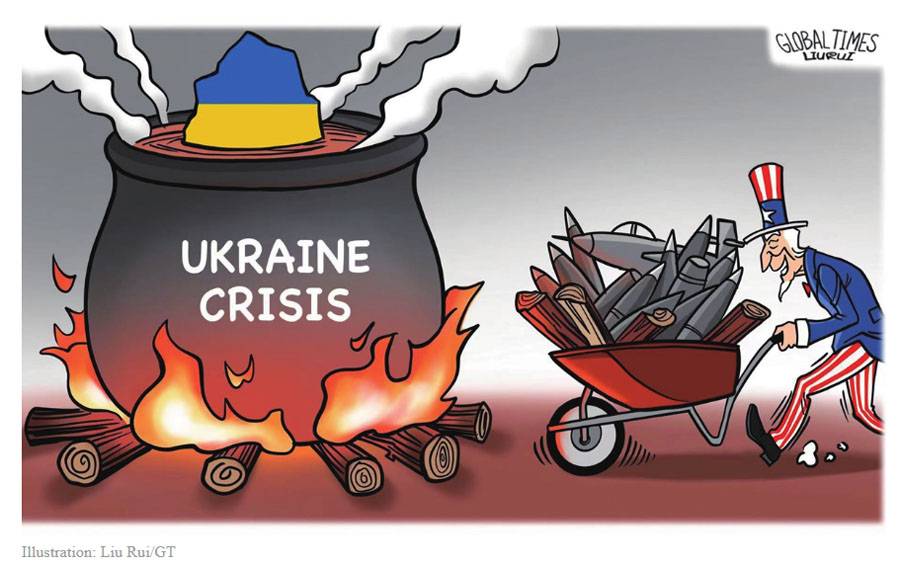Китайское издание Global Times публикует очередной материал, посвящённый событиям на Украине. Материал озаглавлен так: «Есть ли шансы на мир при увеличении поставок США военной помощи Украине?» Проиллюстрировали свою статью китайские обозреватели иллюстрацией Лю Руи, на которой показан котёл, стоящий на костре с кипящим содержимым, в который погружена Украина; при этом к костру спешит «дядя Сэм», в тележке у которого помимо дров ракеты и самолёты.