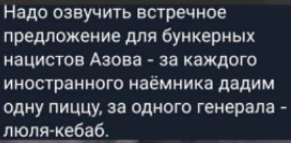 Один из командиров «Азова»*, находящийся в подземных коммуникациях комбината, написал в соцсети, что в связи с отсутствием у его подразделения воды и еды, мирных граждан теперь будут не отпускать, а менять на продовольствие: 15 человек на 1 тонну продуктов и лекарств.