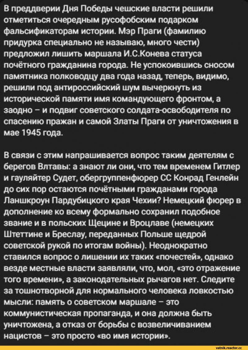 В Праге продолжают уничтожать память о маршале Коневе - командующем войсками 1-го Украинского фронта, освободившими в мае 1945 года столицу Чехословакии от фашистов. Сегодня власти города лишили советского военачальника статуса почетного гражданина чешской столицы, который был присвоен ему 6 июня 1945 года.