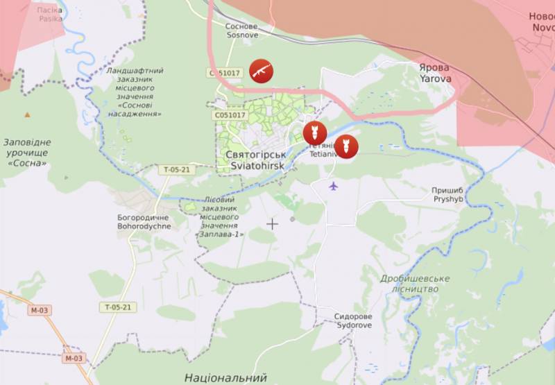 Одновременно с этим активные бои идут в районе Святогорска, где, отступая, украинские войска осуществили обстрел позиций, которые сами оставили при наступлении российских войск и подразделения НМ ДНР. В итоге загорелся деревянный Святогорский храм.