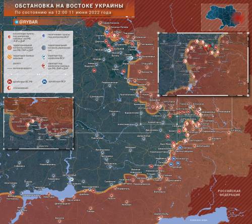 В то же время, по сведениям, поступающим от украинских источников, главком ВСУ Залужный признал, что оставшиеся на заводе "Азот" подразделения ВСУ попали в окружение. Об этом он сегодня доложил Зеленскому, правда немного в другой форме, заявив, что наблюдаются "сложности в сообщении" с северодонецкой группировкой, которая уже самостоятельно из города не выйдет. Правда имеется еще вариант с преодолением Северского Донца вплавь, благо погода стоит теплая и вода прогрелась. Для этого всего-то и надо покинуть территорию промзоны и добраться до реки, но российские войска мешают.