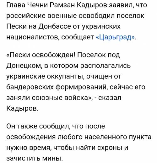 Посёлок Пески, примыкающий к Донецку, являлся одним из основных плацдармов для нанесения украинскими карателями артиллерийских ударов по столице ДНР, сопровождавшихся разрушениями гражданской инфраструктуры и гибелью мирных жителей. В настоящее время данное направление стало одним из основных театров военных действий. В ходе ожесточенных боёв Пески были освобождены бойцами 11-го полка Народной милиции ДНР и батальона «Сомали»; союзные войска развивают наступление далее на запад. При этом в ГШ ВСУ продолжают твердить, будто в Песках украинские войска остаются и ведут бой.