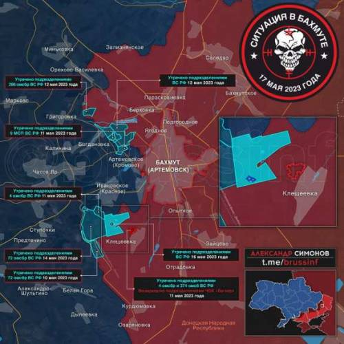 К вечеру среды, 17 мая, подразделения ЧВК «Вагнер», взяв под контроль ещё несколько сотен квадратных метров территории на западе Артёмовска, снизили процент контролируемых противником городских территорий менее чем до 2,5%. По последним данным, ВСУ в Артёмовске (Бахмуте) к настоящему моменту контролируют менее 1 кв. км территории. Фактически это несколько полосок на юго-западе и в западной частях, в том числе близ выезда на Хромово (Артёмовское), где идут тяжёлые бои. Противник контролирует несколько многоэтажек, которые при этом с нескольких сторон простреливаются «Вагнером», отряды которого ведут штурмы «волнами».