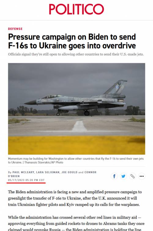 Вчера советник президента США Джо Байдена по вопросам национальной безопасности Джейк Салливан заявил, что вопрос о передаче истребителей F-16 украинскому режиму по-прежнему не рассматривается. В Европе также далеко не все страны готовы присоединиться к т.н. «истребительной коалиции», о которой заявлял ранее президент Украины Владимир Зеленский, да и без разрешения США на передачу самолетов эта коалиция просто не будет иметь смысла.