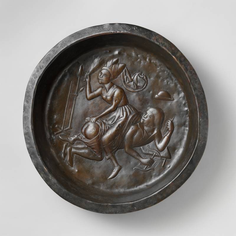 Иногда посуду и даже самые обычные кухонные тарелки ремесленники выделывали с большим юмором. Вот, например, чеканная медная тарелка из Нидерландов, 1480 года, на которой жена задает порку своему мужу! Метрополитен-музей, Нью-Йорк