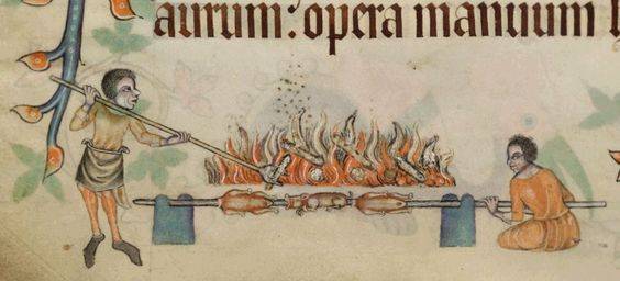 Миниатюра из знаменитой «Псалтыри Латрелла». Приготовление жаркого на вертеле. Ок. 1320–1340 гг. Линкольншир. Британская библиотека, Лондон