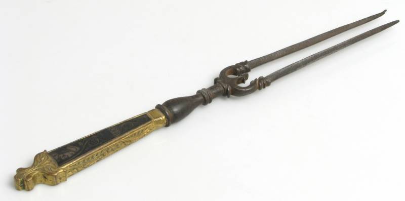 Двузубая вилка из Италии, XIV век. Сначала такие вилки употреблялись дамами при поедании фруктов, чтобы не запачкаться фруктовым соком. Но потом они вошли в обиход повсеместно. Метрополитен-музей, Нью-Йорк