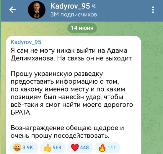Рамзан Кадыров уже обратился к украинской разведке, пообещав "щедрое вознаграждение" за информацию о месте нанесения удара, в результате которого и был "уничтожен" российский депутат.