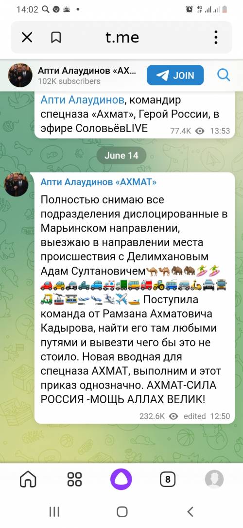 Полностью снимаю все подразделения дислоцированные в Марьинском направлении, выезжаю в направлении места происшествия с Делимхановым Адам Султановичем. Поступила команда от Рамзана Ахматовича Кадырова, найти его там любыми путями и вывезти чего бы это не стоило. Новая вводная для спецназа АХМАТ, выполним и этот приказ однозначно. АХМАТ-СИЛА РОССИЯ -МОЩЬ АЛЛАХ ВЕЛИК!
