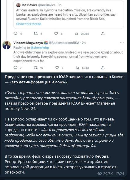 Как и следовало ожидать, перед приездом Рамафосы украинские власти объявили воздушную тревогу. Такие действия являются традиционными для украинского режима во время приездов иностранных делегаций. Только в этот раз подобный ход выглядит совсем неуместным.