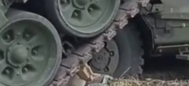 После этого, видимо, пытаясь экстренно покинуть зону обстрела, экипаж боевой машины принял решение сдавать назад, но уперся в идущий следом MRAP MaxxPro. Какое-то время танк толкал броневик, а затем и вовсе буквально «запрыгнул» на него.