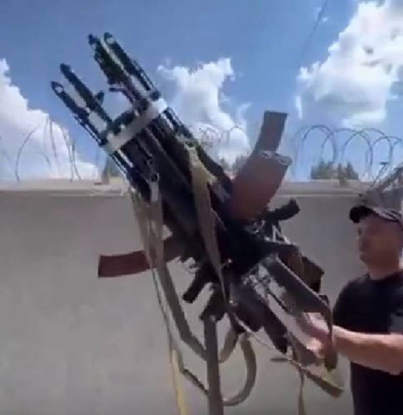 Недавно были опубликованы кадры, на которых демонстрируется очередная «новинка украинского военпрома». Боевики ВСУ смастерили «зенитку» из АК, пытаясь решить проблему дефицита средств противовоздушной обороны. Для этого они соединили несколько автоматов, установив их на специальную подставку. С помощью такой самодельной «зенитной автоматной системы» украинские боевики рассчитывают сбивать российские беспилотные летательные аппараты и вертолеты.