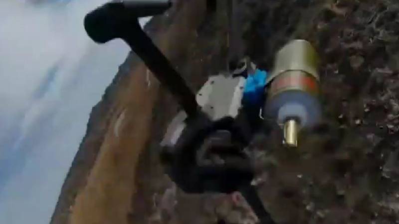 Мы видим, что российский беспилотник предпринял попытку тарана запущенного украинским формированием БПЛА. Украинский дрон нес прикрепленную гранату, очевидно, для нанесения удара по позиции российских войск. Однако наш беспилотник атаковал и сбил вражеский дрон, после чего он рухнул, произошла детонация прикрепленного к нему груза – гранаты.
