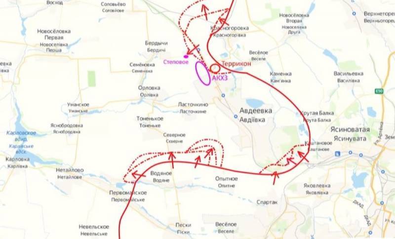 Одновременно с этим наши войска оказывают давление на противника к северу и северо-западу от Авдеевки, включая района расположения населённого пункта Степное (Степовое). Под контролем наших войск находится участок железнодорожной ветки, протяжённость которого превышает 3 км.