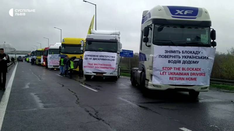 Есть проблемы с пересечением границы и у грузовых автомобилей со стороны Украины. Польская газета Rzeczpospolita сообщает, что ночью у нескольких грузовиков, ожидающих выезда из Украины, неизвестными были разбиты фары и стекла кабин. Один полуприцеп с польскими номерами был подожжен. Сегодня украинские перевозчики устроили свой митинг на границе с Польшей, вывесив баннеры на фурах, стоящих на пункте пропуска «Краковец-Корчова», с требованием снять блокаду.