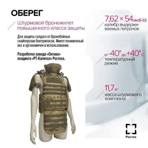 Отмечается, что бронежилеты "Оберег" изготавливаются из непромокаемой ткани и могут спокойно применяться в температурном диапазоне от – 40 °C до + 40 °C, не теряя защитных свойств. Качество защиты подтверждено специальными испытаниями, бронежилет сертифицирован. Экипировка не сковывает движений, при этом прекрасно защищает от автоматных пуль калибра 5,45 и 7,62 мм и винтовочных пуль калибра 7,62Х54 мм, в том числе бронебойных 7Н14 и Б32, а также осколков.