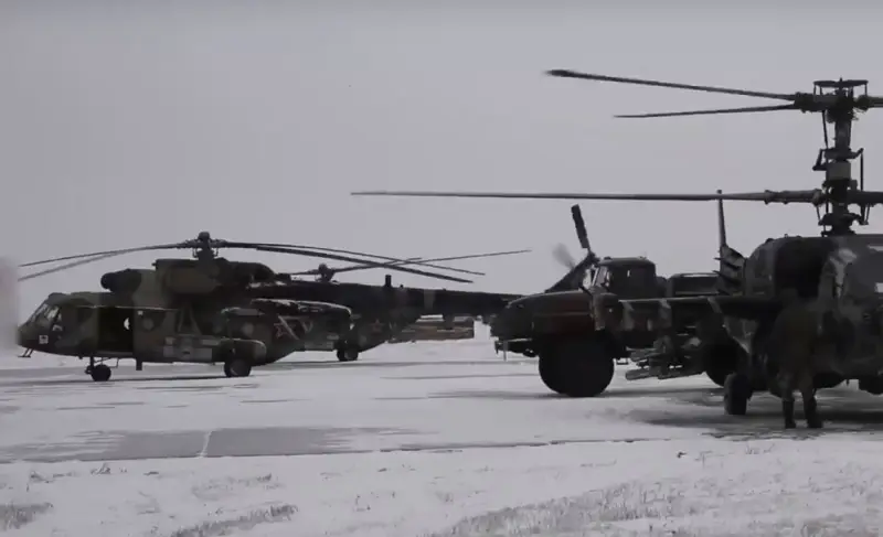 Минобороны РФ сообщило, что в состав ударной группы армейской авиации были включены три вертолета: разведывательно-ударный вертолет Ка-52 «Аллигатор», транспортно-боевой вертолет Ми-35М и многоцелевой вертолет Ми-8.