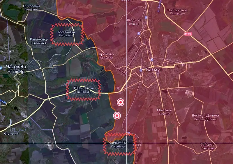 На южном фланге бои у Клещеевки привели к полуохвату территории села, наши войска продвигаются по высотам севернее. Это хорошо видно на карте. К северо-западу от Артемовска в Богдановке идут бои у восточной и северной окраин населенного пункта, подразделения ВДВ ВС РФ закрепились на одной из них.