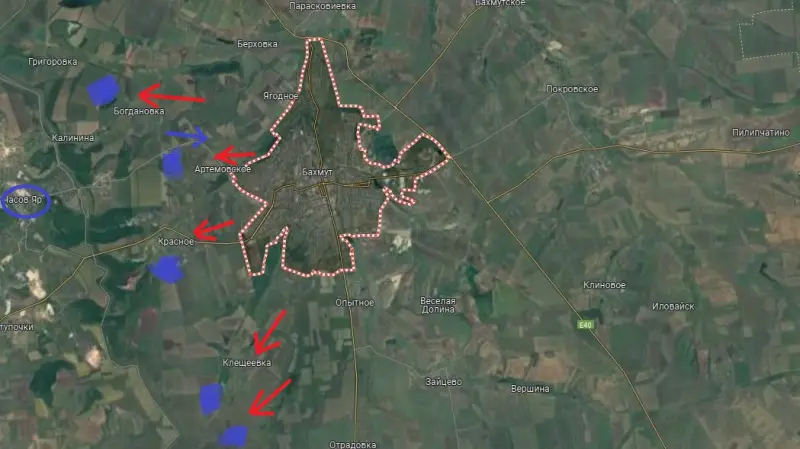 Направления действий российских войск на флангах Артемовского участка фронта выделены красным цветом, места сосредоточения сил противника и направления его контратак - синим цветом.