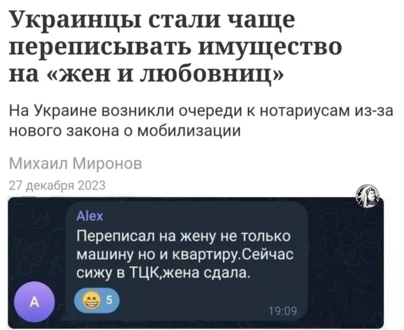 Один из популярных украинских журналистов и телеведущий сообщает, что украинцы массово пошли к нотариусам переписывать свое имущество, недвижимость, автомобили и другие активы, владение которыми требует госрегистрации, на «жен, матерей и даже любовниц» после появления нового законопроекта о мобилизации. Дело в том, что если законопроект будет принят в нынешней редакции, то для нарушителей порядка воинского учета, помимо других репрессивных и ограничительных мер, могут оказаться под запретом любые операции с собственностью.