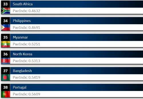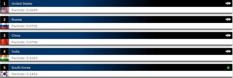 В первую пятерку стран с сильнейшими в мире армиями, помимо России и США, также вошли армии Китай, Индия и Южная Корея. Далее в рейтинге следуют армии Великобритании, Японии, Турции, Пакистана и Италии.