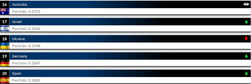Украина оказалась на 18 месте в рейтинге, опустившись, по сравнению с показателями прошлого года, на три строчки в списке, немного уступив по силе армии Израиля, однако опередив вооруженные силы Германии, Испании и Польши. Странами с самыми слабыми в мире армиями, согласно рейтингу, оказались Бенин, Сомали, Суринам, Бутан и Молдавия.