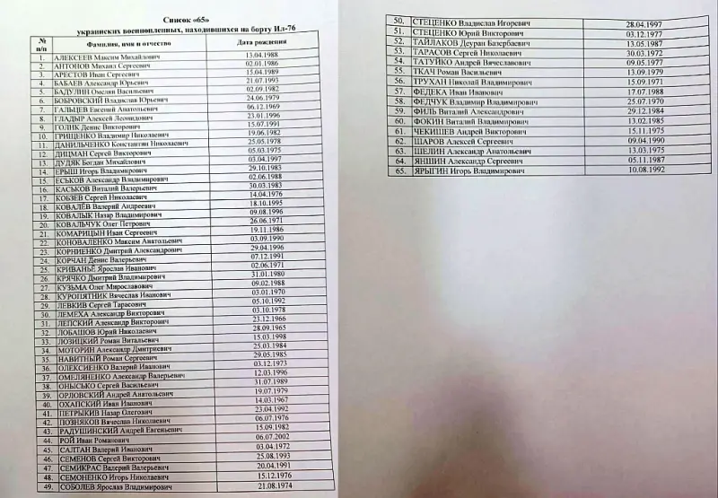 Главред телеканала RT Маргарита Симоньян опубликовала в своем телеграм-канале список 65 украинских военнопленных, которые, как утверждается, находились на разбившемся под Белгородом Ил-76. Близкие этих солдат, большинство из которых были тяжело ранеными, уже вот-вот встретили бы их дома. Самому младшему из погибших был 21 год.