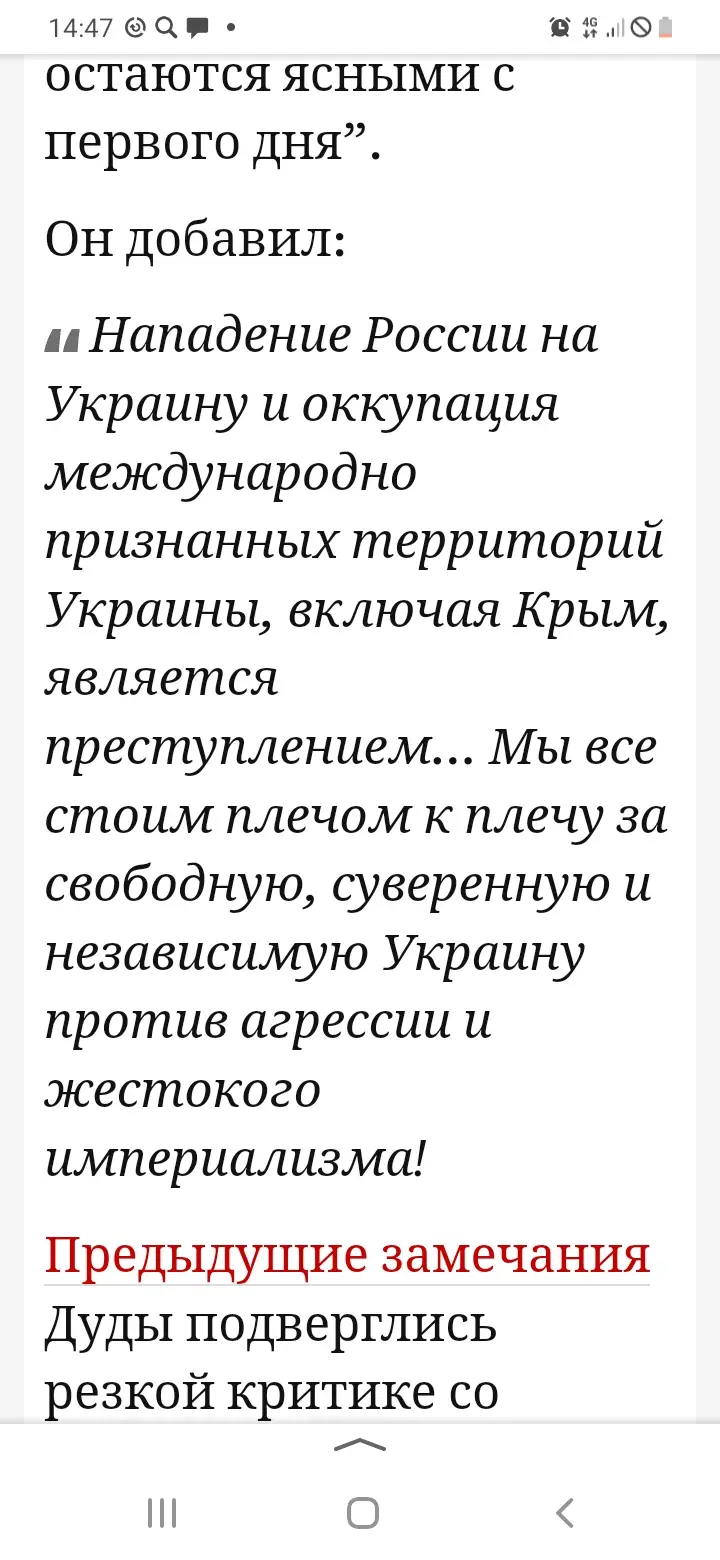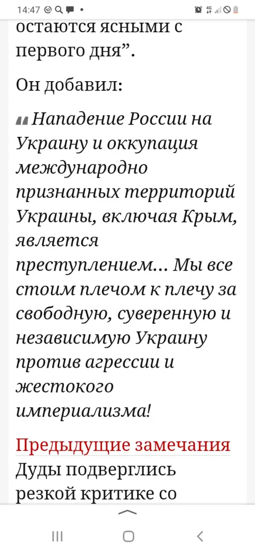 Ранее Дуда высказался против проведения любых переговоров между Киевом и Москвой. Президент Польши заявил, что, по его мнению, вооруженный конфликт на Украине не должен завершаться до тех пор, пока Киев не вернет свой контроль над всеми территориями, ранее входившими в состав Украины.