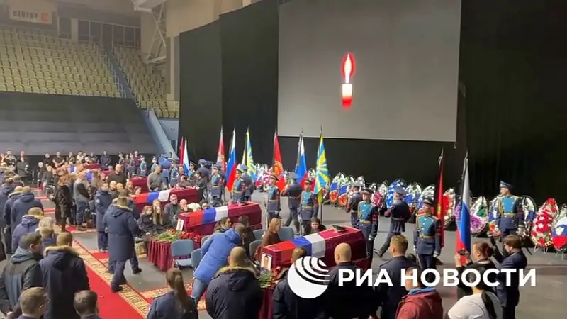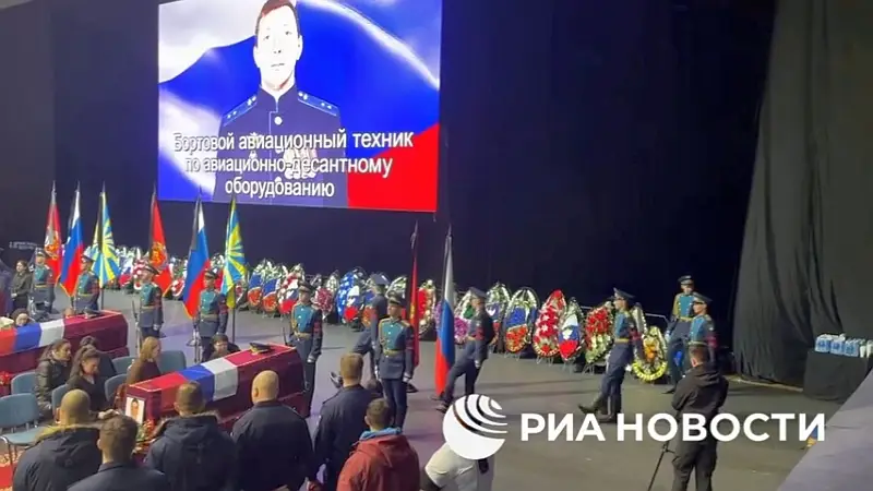 Сегодня в родном для экипажа сбитого ВСУ Ил-76 Оренбурге прошла церемония прощания с пилотами. Мероприятие состоялось в спортивно-культурном комплексе «Оренбуржье». Церемония собрала сотни людей, которые проводили погибших летчиков в последний путь. Около гробов членов экипажа и на сцене было возложено множество венков от коллег-военнослужащих, правительства и законодательного собрания региона.