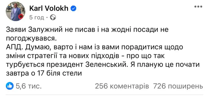 На Украине призвали к новому майдану. Сообщение с призывом выходить на площадь Незалежности опубликовал украинский блогер Карл Волох, являющийся сторонником Петра Порошенко. Запись появилась сразу же после отставки Залужного. Волох предложил всем желающим присоединиться к нему на майдане, чтобы "обсудить" действия Зеленского.